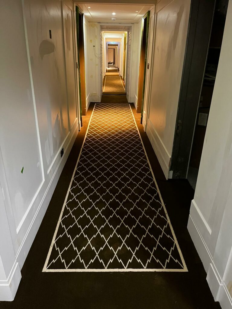 One of the primary challenges of the project was the installation of bespoke patterned panel carpets throughout the hotel corridors. Each panel required precise measurement and setting out to maintain pattern alignment and visual consistency, made more complex by the hotel’s unusual geometry and varying corridor dimensions. Detailed planning and execution were essential to achieve a uniform, high-end finish across all areas.