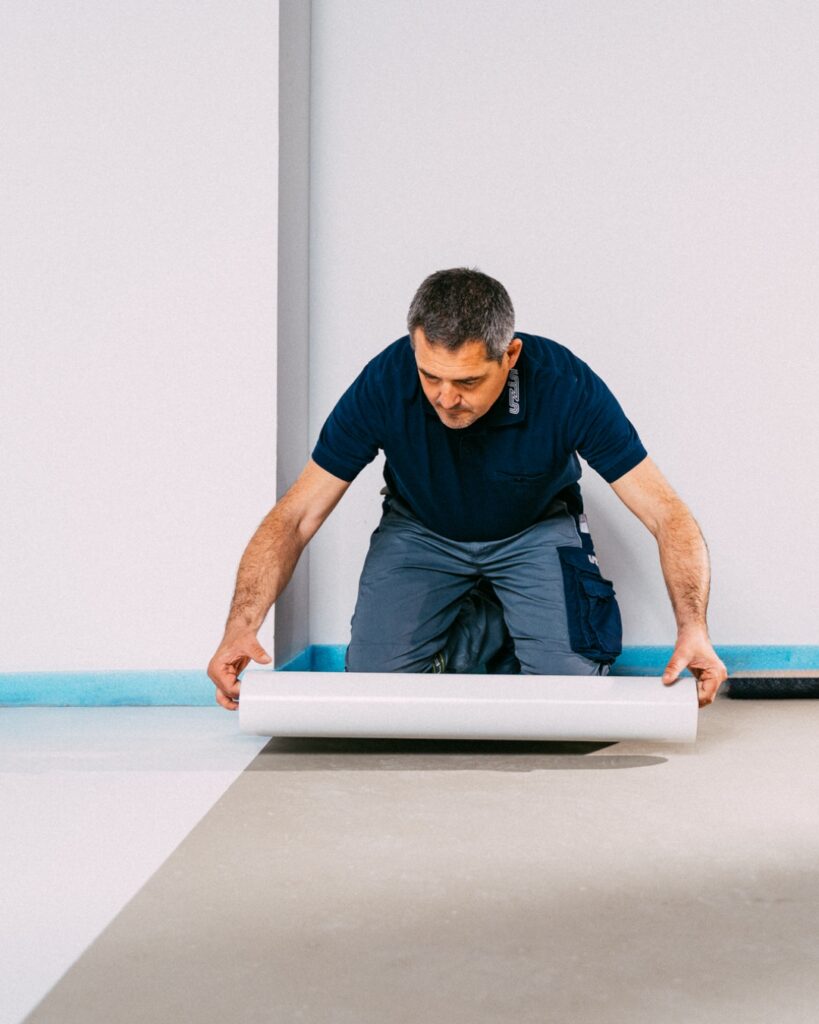 The installation process is straightforward and designed to expedite the overall schedule. If the subfloor is even and free of residues or contaminants, you can apply the tape directly to the subfloor and then proceed to install the floor covering. If the subfloor is dusty, first prime it with UZIN PE 360 PLUS where necessary. Since Plurafilm Hydro is ready for foot traffic immediately, there is no need to wait the usual 24–48 hours for the adhesive to cure, allowing businesses to resume operations much faster. For uneven screeds, prime the subfloor with UZIN PE 360 PLUS before pre-smoothing it with a moisture-tolerant smoothing compound, such as UZIN NC 161. The following day, lay UZIN Plurafilm Hydro and fit the floor covering.